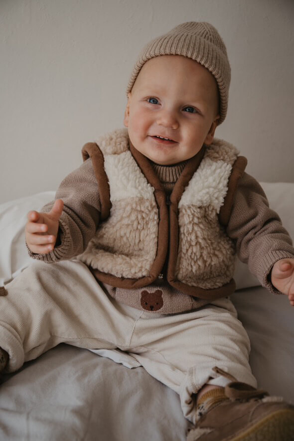 Handgemaakte merino wollen bodywarmer met rits dubbel kleurig