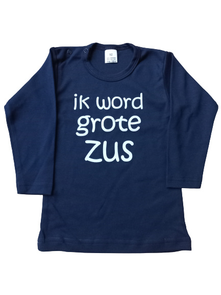 Een superleuk donkerblauw shirtje met de tekst ik word grote zus van 100% katoen. Het shirtje mag gewassen worden op 40 graden. Het shirtje is makkelijk aan te trekken door de knoopjes op de schouder.